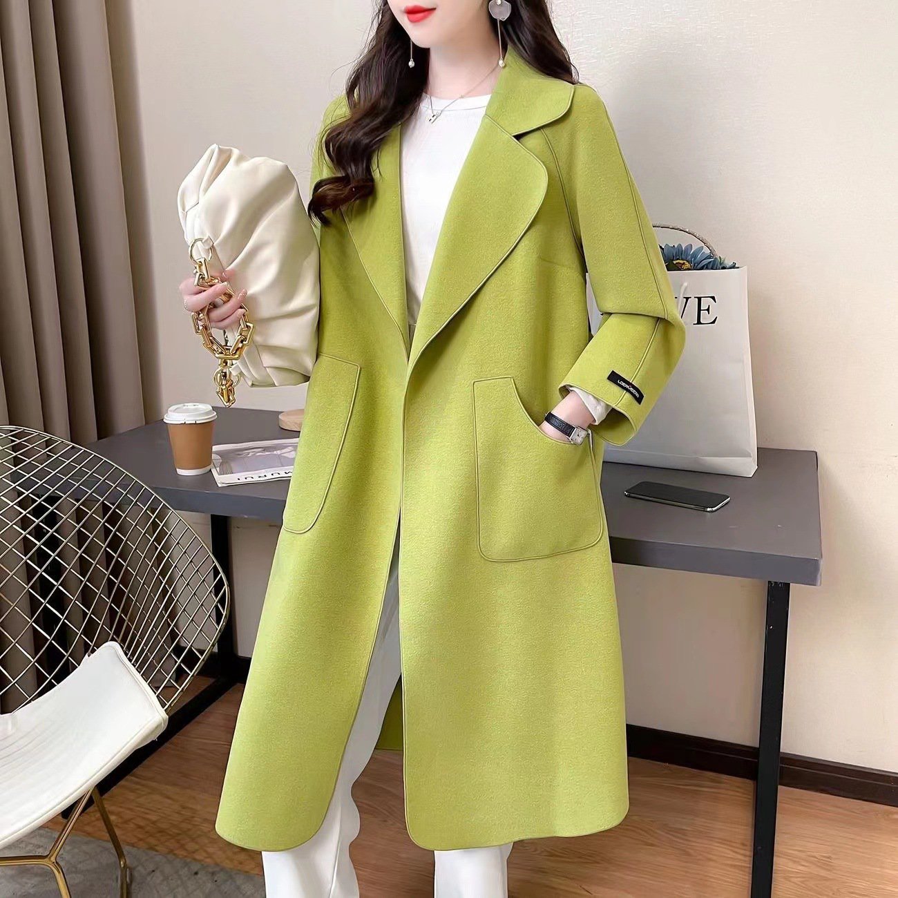 그린 폴라폴리스 스트링 모직 코트녀